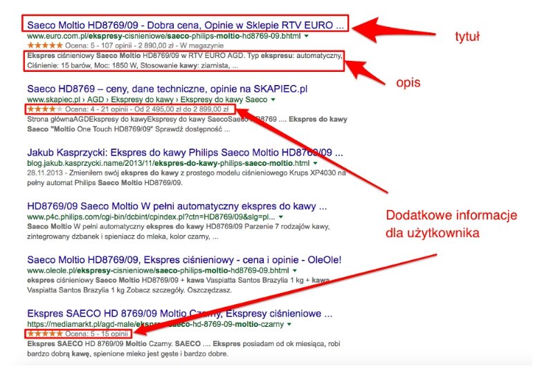 Jeśli wszystkie opisy i tytuły będziemy mieć takie same lub będą zawierały tylko nazwę produktu, to nie zachęcamy klienta za bardzo do kliknięcia. W przypadku każdej strony warto podkreślić USP (ang. unique selling proposition) swojego sklepu, użyć zwrotu CTA (ang. call to action). To często jest zaniedbywane. Z drugiej strony brak regularnego nadzoru nad tymi elementami może doprowadzić do sytuacji, w której w wynikach wyszukiwania pojawia się informacja nieprawdziwa, która doprowadzi klienta do irytacji i rezygnacji z zakupów. Jeśli piszemy w tytule strony wyświetlanym w Google “najtańsze ekspresy do kawy”, a na stronie klient widzi niezbyt atrakcyjne ceny, to strzelamy sobie w kolano (tak samo jeśli oferujemy produkty klasy premium, dla których cena nie musi być najważniejszym czynnikiem). W takiej sytuacji warto by było wyeksponować inny aspekt oferty - najszerszy wybór, doradztwo przy wyborze modelu, serwis gwarancyjny etc. To mogą być zarówno argumenty racjonalne, obiektywne, jak i emocjonalne, chociaż z nimi trzeba szczególnie uważać. Najgorsze, co może zrobić marka - zarówno w e-commerce, jak i w innych segmentach rynku - to coś obiecać, a potem tego nie dostarczyć. W tym kontekście także warto pamiętać, że User Experience to nie ładny layout lub przykuwające uwagę animacje, ale strategia obejmująca całokształt odczuć użytkownika (lub szerzej - konsumenta) w kontakcie z marką (w tym przypadku - danym sklepem internetowym).