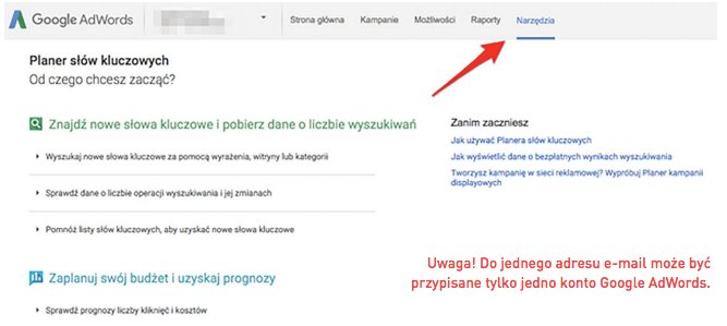 Podstawowym narzędziem, które powinno Cię zainteresować (bez względu na to, czy prowadzisz kampanie AdWords, czy nie), jest planer słów kluczowych. Aby z niego skorzystać, musisz założyć konto Google i utworzyć konto w usłudze AdWords (wejdź na adwords.com i postępuj zgodnie z instrukcjami).