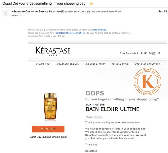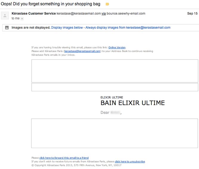 Testowanie, czyli sprawdzanie różnych sposobów na to jak spełnić wyjątkowe potrzeby naszych klientów, i monitorowanie ich skuteczności, czyli sprawdzanie otwieralności (OR), klikalności (CTR) i konwersji. Warto testować szablony wiadomości, które różnią się nie tylko tonem komunikacji z klientem, ale też zawartością graficzną, bo zdjęcia i pliki graficzne potrafią płatać figle. Poniżej przykład e-maila przypominającego o niedokończonym zamówieniu ze sklepu internetowego Kérastase, w którym ustawienia skrzynki mailowej odbiorcy ukryły obrazy: