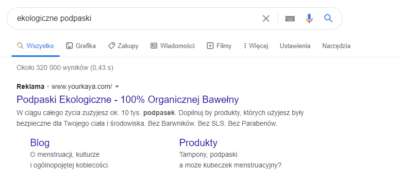 Your KAYA oswaja ten temat, mówiąc, że każda przeżywa inaczej ten czas – czasem boleśnie, czasem bez bólu, ale jest to doświadczenie wspólne dla połowy populacji. Your Kaya umacnia swoje USP poprzez reklamy w Google ADS – podkreślają tam brak dodatków typu chlor. Targetują reklamy na hasła powiązane z ekologią.