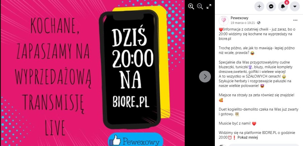 Sklep Pewexowy.pl – butik z odzieżą damską, skupiający ok. 36 tys. fanów na Facebooku, transmitujący 3 razy w tygodniu. Kilkugodzinna transmisja, udostępniona 2,4 tys. razy ma widoczność na poziomie ok. 40 tys. Dociekliwy fan marki może oszacować ilość zamówień, która dla 4-godzinnej sesji wynosi ok. 20 na 100 komentarzy, przy całkowitej liczbie komentarzy na poziomie od 4 do 5 tys.