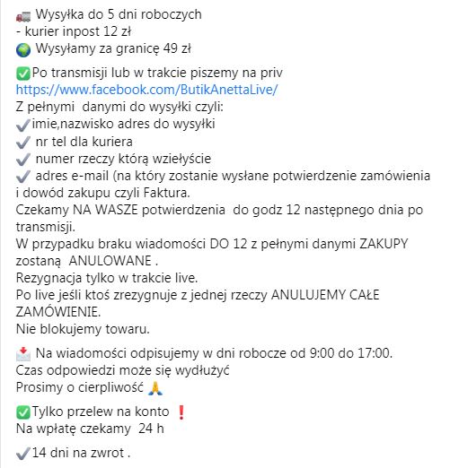 Potwierdzenie zamówienia i obsługa posprzedażowa Po zakończonej transmisji uczestnik musi potwierdzić zamówienie w wiadomości prywatnej (lub przejść na docelową platformę sprzedażową). Na tym etapie podawane są szczegóły – dane osobowe, adres itp. Brak potwierdzenia oznacza anulowanie zamówienia, przy braku płatności (i braku informacji zwrotnej) należy liczyć się z opcją zablokowania uczestnictwa w kolejnych transmisjach. Większość sklepów umożliwia realizację dodatkowego zakupu osobom, którym nie udało się dołączyć do transmisji. Oferta dotyczy zazwyczaj produktów popularnych, najchętniej kupowanych.