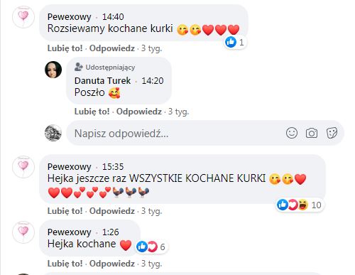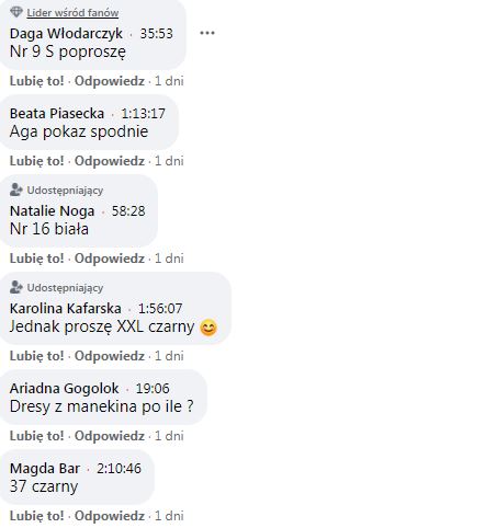 Prośba o udostępnienie nagrania Standardowa metoda na poszerzenie zasięgu, będąca zazwyczaj wymogiem uczestnictwa w wydarzeniu. Komunikacja w trakcie live’ów jest w pełni nastawiona na odbiorcę – cel to maksymalne skrócenie dystansu, ośmielenie użytkowników i zbudowanie zaufania. Im prostszy, bardziej przyjazny komunikat – tym łatwiej o wywołanie pozytywnych reakcji. Standardowe, marketingowe sformułowania typu „Szanowni Państwo”, „Drodzy klienci” są zazwyczaj zastępowane bezpośrednimi zwrotami typu „Kochane dziewczyny”. Zdarza się, że sprzedawca skraca dystans jeszcze mocniej, przechodząc do zwrotów typowych dla grona koleżeńskiego: „Słuchajcie myszki, mam tu piękną bluzę!”, „Jesteście tu kochane?”, „Moje drogie – Zaczynamy!”