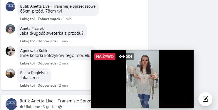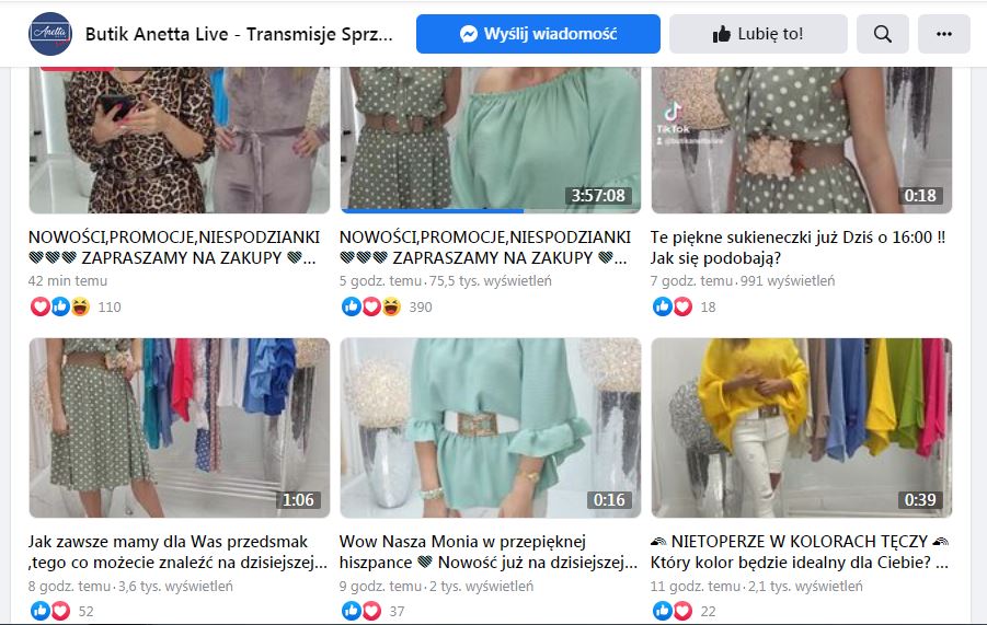 Butik Anetta Live – sklep odzieżowy sprzedający wyłącznie za pośrednictwem live shoppingu przez Facebooka, ilość fanów: 77 tys. W trakcie 4 godzin transmisji, w której bierze udział ok. 600 osób przyjmuje się średnio ok. 350 zamówień (z poprawką na osoby anulujące zgłoszenie). Wartość pojedynczego zamówienia waha się w granicach 59-100 zł. Transmisje odbywają się 4 razy w tygodniu. Ok. 800 udostępnień live’a przekłada się na zasięg na poziomie 75 tys. wyświetleń.
