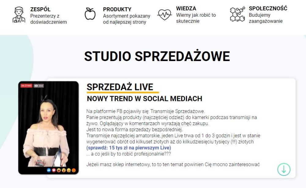 Usługa zdalnego sprzedawcy lub pełna obsługa live’a – nowość na rynku marketingowym, dostępna w ofercie agencji studiokiwi.pl. Tu mamy do czynienia z kompleksowym wspomaganiem sprzedaży – począwszy od wsparcia technicznego, przez przygotowanie studia nagraniowego po pomoc profesjonalnych prezenterów. Usługa reklamowana jest jako opcja dostępna zarówno dla początkujących, jak i zaawansowanych sprzedawców.