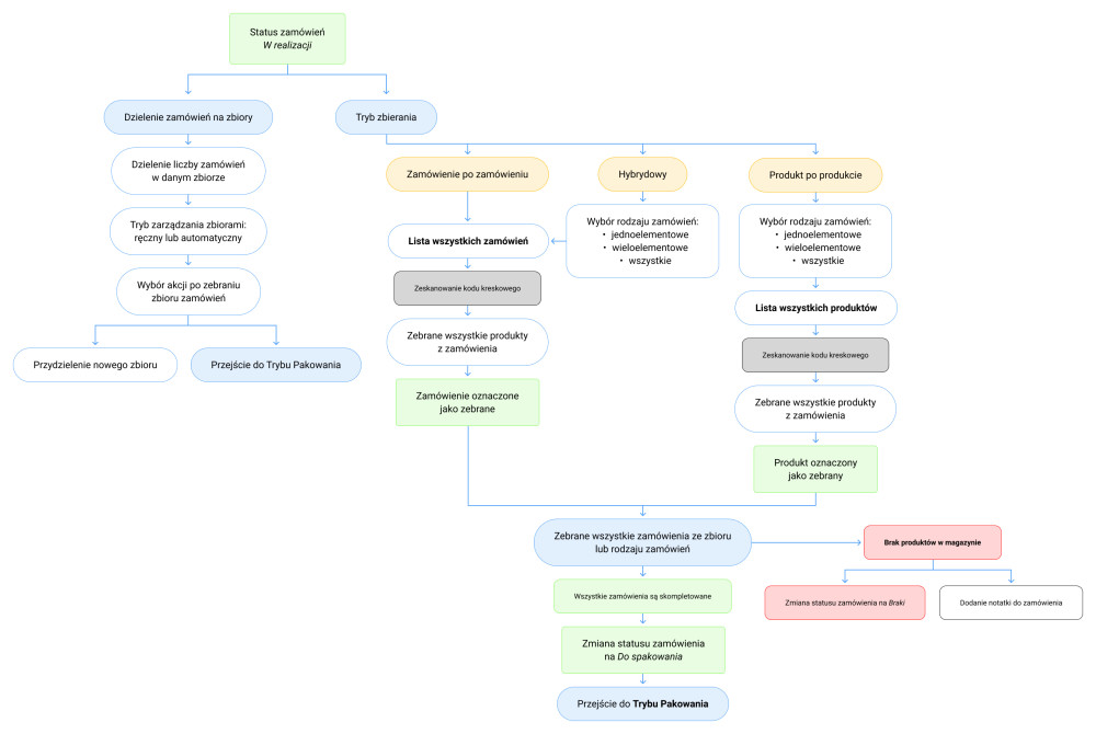 W trybie zbierania, do systemu zostają przesłane nowe zamówienia, a produkty z nich zostają posegregowane zgodnie z jedną z trzech obranych strategii i wyświetlone użytkownikowi w kolejności zebrania. System (dzięki oznaczeniu regałów i półek na mapie magazynu) układa pracownikowi najszybszą ścieżkę, którą musi pokonać w magazynie, aby zebrać wszystkie produkty z przypisanych do użytkownika zamówień. Proces zbierania jest bardzo prosty - przy użyciu skanera pracownik kolekcjonuje wszystkie towary zamówione przez klientów w danym przedziale czasowym i przekazuje je do pakowania.