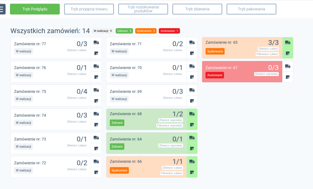 Czy powyższe procesy można obserwować na bieżąco? Oczywiście! Tryb Podglądu pozwala śledzić postęp zbierania produktów oraz pakowania zamówień. Jest to widok z podsumowaniem obrazującym wszystkie aktualne prace nad kompletowaniem zamówień, zarówno tych spakowanych, jak i tych będących w toku.