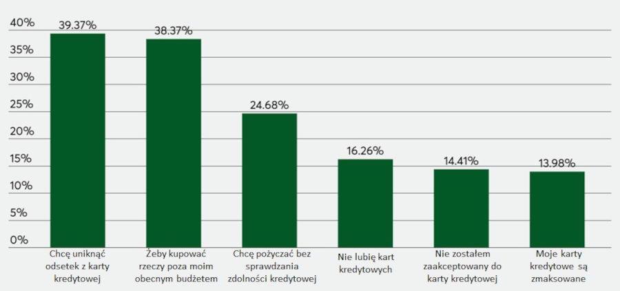 Niepokojące natomiast mogą być odpowiedzi udzielone przez niektórych respondentów w badaniu przeprowadzonym w lipcu 2020. Jak wskazuje DNA RYNKÓW na pytanie „Dlaczego korzystasz z płatności kup teraz płać później (BNPL)?” aż 14,41% pytanych odpowiedziało „Nie zostałem zaakceptowany do karty kredytowej”. Wyniki tego badania przedstawiono poniżej.