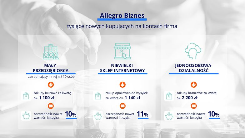 Ponad 40 mln ofert obejmuje zniżki i rabaty hurtowe. Allegro udostępniło narzędzia dedykowane sprzedaży B2B, które są dostępne tylko dla kupujących przedsiębiorców. Dzięki nim zwłaszcza małe firmy są w stanie zaoszczędzić ponad 10% na zakupie artykułów biurowych, pakowych lub materiałów niezbędnych pracownikom do wykonywania swoich obowiązków (w przypadku salonu kosmetycznego mogą to być np. pilniki, lakiery, cążki i ręczniki jednorazowe). Poniższa infografika obrazuje wyliczenia Allegro, ile przeciętnie mogą zaoszczędzić przedsiębiorcy.