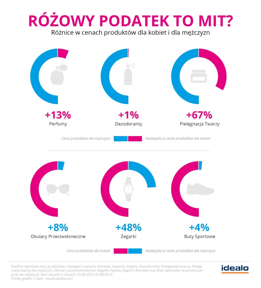 Kwestie związane z równouprawnieniem kobiet i mężczyzn wciąż jeszcze wywołują wiele emocji i kontrowersji. Często dotyczy to również finansów. Z danych Głównego Urzędu statystycznego wynika bowiem, że przeciętne miesięczne wynagrodzenie brutto mężczyzn w 2014 roku było aż o 20,6% wyższe od przeciętnej pensji kobiet. Paradoksalnie, od kilku lat trwa dyskusja nad tym, czy i dlaczego produkty dla kobiet kosztują więcej niż ich odpowiedniki dla mężczyzn. Porównywarka cen idealo.pl wybrała sześć kategorii artykułów, które na rynku dostępne są w wersji dla pań i panów. Zgromadzone dane służą odpowiedzi na pytanie o to, czy „różowy podatek” rzeczywiście sprawia, że kobiety na te same produkty wydają więcej pieniędzy niż mężczyźni.