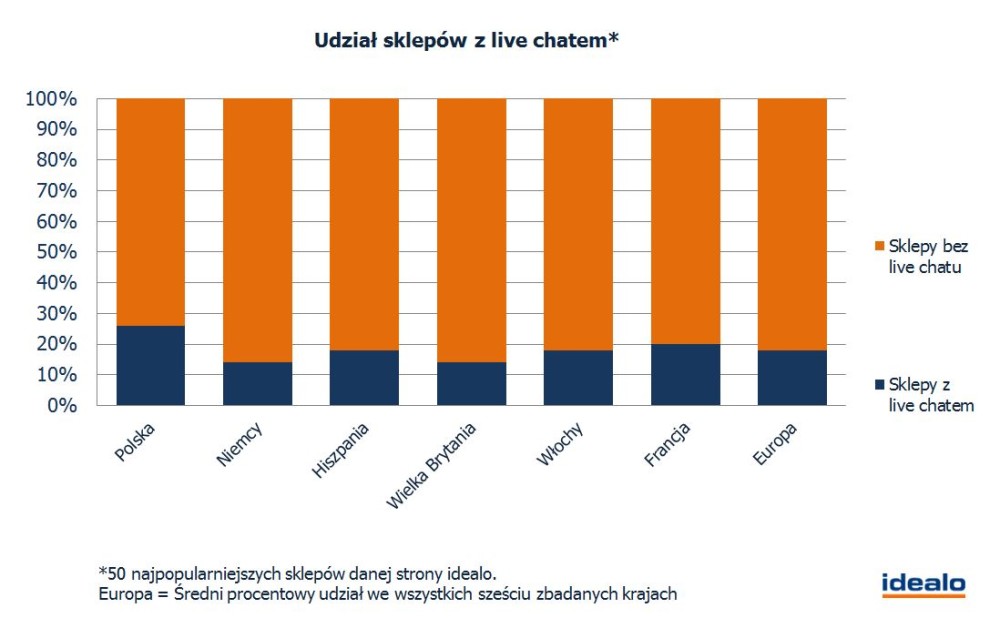 Mimo ogromnego potencjału, mniejszą popularnością niż kontakt za pośrednictwem wiadomości e-mail lub formularza kontaktowego cieszy się doradztwo w zakupach w czasie rzeczywistym. Choć w Polsce nie jest to wciąż najpopularniejsza forma kontaktu, nasze rodzime sklepy sięgają po live chat częściej niż w innych krajach. Z 26% przebadanych przez nas najpopularniejszych polskich sklepów współpracujących z idealo, polscy sprzedawcy nie tylko osiągają wynik wyższy niż pozostałe przebadane kraje, lecz również plasują się ponad europejską średnią. Przewaga jest jednak niewielka – live chat można bowiem znaleźć w 24% sklepów internetowych we Francji i w co piątym w Hiszpanii. Zaraz po nich plasują się Włochy (18%) i Wielka Brytania (16%), zaś z 14% zestawienie zamykają Niemcy.