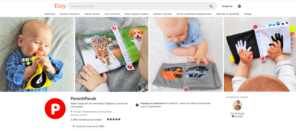 I tak - pośród sprzedawców oznaczonych symbolem <market> znajdziemy sklep ParentiPacek prowadzony przez Kamilę i Szymona Pacek z Poznania. W ich ofercie znajdziemy artykuły dla niemowląt, tj. unikalne książeczki sensoryczne dla najmłodszych, wykonywane również na specjalne zamówienie.