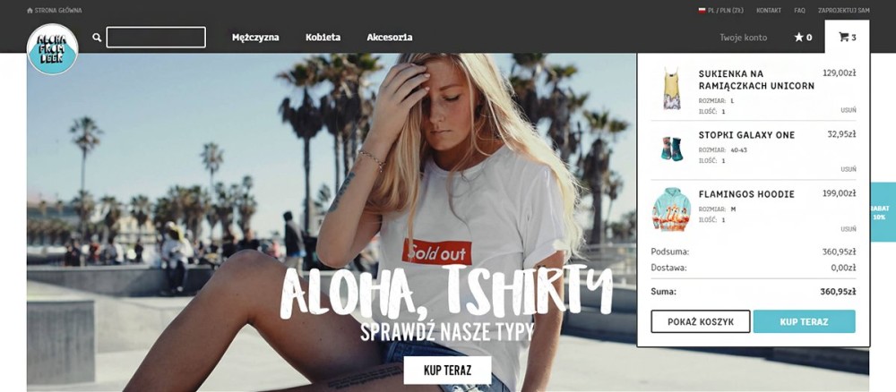 Taka forma koszyka pozwala użytkownikowi na bieżąco kontrolować jego zawartość, zobaczyć jakie produkty już dodał, jaka jest ich wartość, bez przechodzenia do osobnej podstrony.
