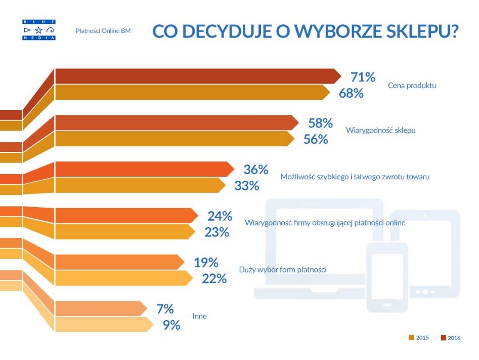 Siedmiu na dziesięciu Polaków deklaruje kupowanie produktów lub usług przez internet. Pozostali klienci są wierni sklepom stacjonarnym, ponieważ po prostu je preferują (61 proc.), nie mają potrzeby kupowania online (47 proc.), nie mają zaufania do zakupów w sieci (15 proc.) bądź uważają ten proces za zbyt skomplikowany (10 proc.). W internecie wciąż kluczową rolę odgrywa niska cena produktu – dla 71 proc. respondentów to najważniejszy czynnik brany pod uwagę przy wyborze sklepu internetowego. W porównaniu do ubiegłego roku coraz więcej osób sprawdza też wiarygodność sprzedawcy (wzrost z 56 do 58 proc.) oraz możliwość szybkiego i łatwego zwrotu towaru (wzrost z 33 do 36 proc.).